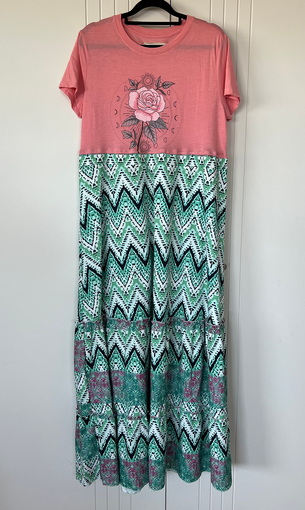 These dresses truly embrace the Mix & Match, perfectly imperfect style featuring a tshirt top and a skirt bottom combined to make a one of a kind dress. Made from sustainable materials, these dresses are not only stylish but also eco-friendly. Perfect for any casual occasion, these one-of-a-kind dresses will make you stand out in the crowd.